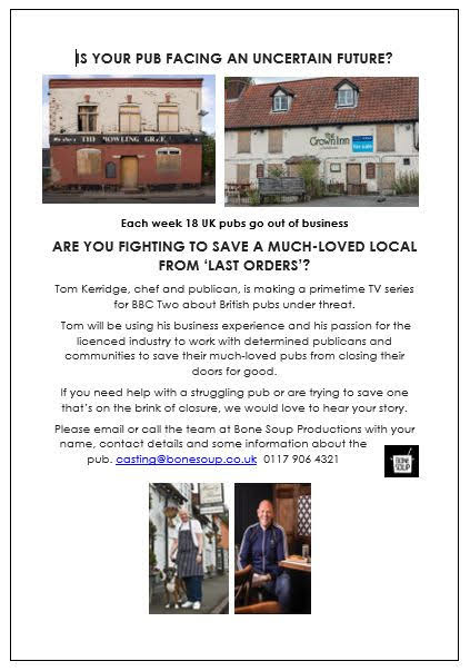 We are interested in filming one of the episodes in the greater Manchester area and if any of the pubs in our region are interested they’re welcome to call to discuss on 0117 906 4321 or email casting@bonesoup.co.uk we are hoping to film this autumn so it would be great to hear from them ASAP.