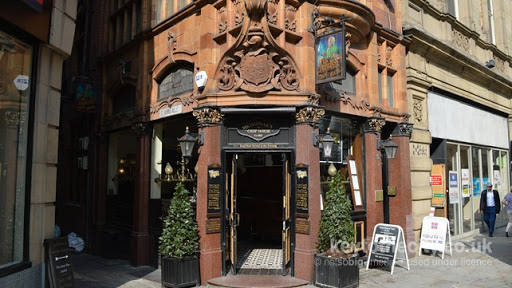 Referred to in the CAMRA inventory as a ‘Jacobean confection from 1901’. The front was originally a shop and offices designed by architects Mills and Murgatroyd and the rear part facing St Anne’s Square was by Woodhouse and Willoughby, also 1901. Externally the façade comprises an attractive flamboyant terracotta and brick gable fronting on to Cross Street extending part way down St Anne’s Alley. But the star of the show is the internal decoration. The interior consists of four spaces, one behind the other, decorated by light green ceramic arches. A similarly coloured dado runs along much of the walling and the third compartment from the front also has plain cream tiling, extending to the ceiling. The small area at the back has an outstanding ceramic fireplace. Black and white tiled flooring runs throughout the pub. Over half of this fine interior operates as a fine quality restaurant. The painter L.S.Lowry was a regular in days gone by.